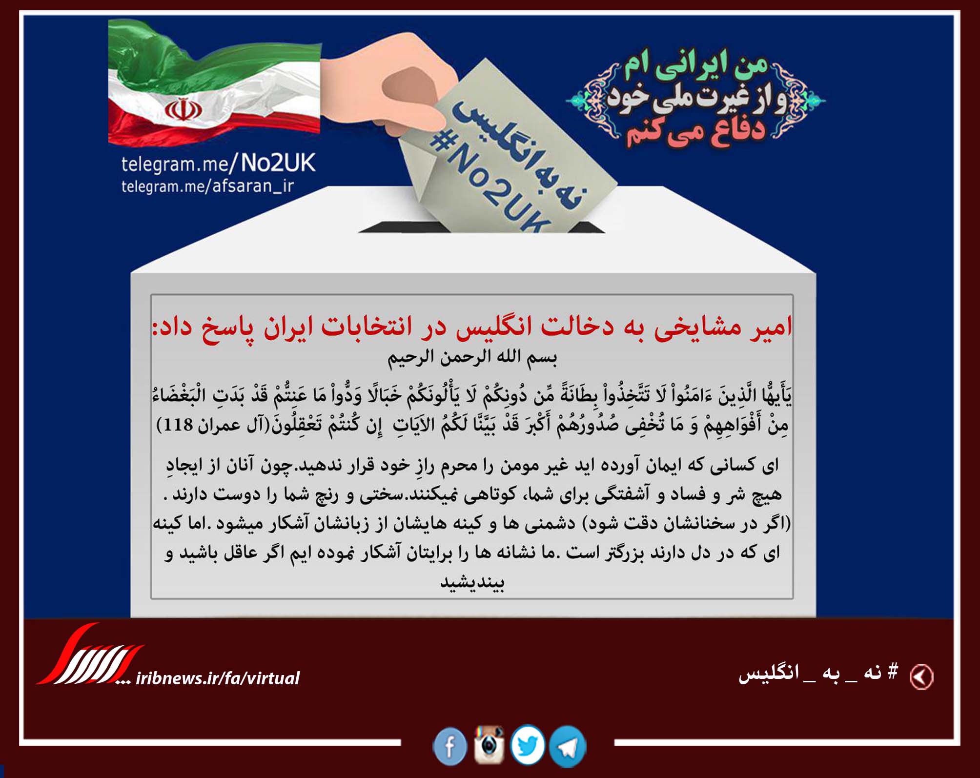 به گزارش سرویس فضای مجازی خبرگزاری صدا وسیما در پی دخالت آشکار رسانه سلطنتی انگلیس در انتخابات ایران و تعیین خط مشی برای رای دهندگان ایرانی تا آنجا که به صراحت اعلام کرد که به چه اشخاصی رای ندهند، کاربران فضای مجازی با تشکیل کمپین «نه به انگلیس- No2Uk» #نه_به_انگلیس در دفاع از غیرت ملی خود نسبت به این رفتار مداخله جویانه واکنش نشان دادند این کمپین در تلگرام به آدرس : telegram.me/No2UK قابل دسترسی است. تصاویر ارسالی کاربران به این کمپین را می توانید مشاهده کنید.