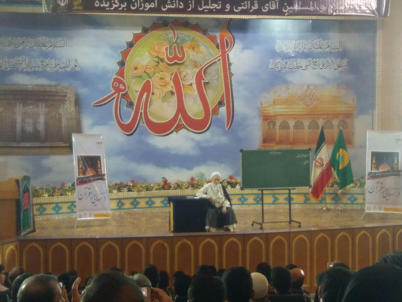 به گزارش خبرگزاری صداوسیما ، این همایش هر ساله در هفته اول مهر‌ماه با حضور مسئولان حوزه معاونت پرورشی آموزش و پرورش و شخصیت‌های دینی و مسئولان کشوری برپا و از دانش‌آموزان برگزیده مدارس شهر تهران 1 و 2 شهر ری و شهرستان های تهران تجلیل بعمل آمد.در ادامه حجت الاسلام موحودی نژاد رئیس موسسه ترویج فعالیت های قرآنی گفت : مسابقات درس هایی قرآنی حاج آقا قرائتی 25 سال هست که برگزار می شود وبه حمداله مورد استقبال واقع شده حدود 3 میلیون دانش آموز الان در مقاطع اول ودوم دبیرستان تحت پوشش این برنامه اند که هر هفته برنامه درسهایی از قرآن را از تلویزیون می بیندند ودر این برنامه مسابقات شرکت می کنند ، سایتی هم در کنار این برنامه راه اندازی شده که یک مجموعه دارد به نام قرآن اسکول ، متن ها دراختیار افراد قرار می گیردو یک برنامه ای داریم که از همان کانل وسایت به عنوان انس با قرآن و حزواتی آماده ودر سایت قرار داده می شودتا دانش آموزان ونسل جوان از آن به توانند استفاده کنند ، یک برنامه ای خلاصه نویسی ماه مبارک رمضان داریم و همچنین تهیه مقالات قرآنی صورت میگیرد ما سعی کردیم از این فناوری حداکثر استفاده را در حد توانمان داشته باشیم.در پایان این برنامه افراد برگزید با حجت الاسلام قرائتی عکس یادگاری گرفتند.
