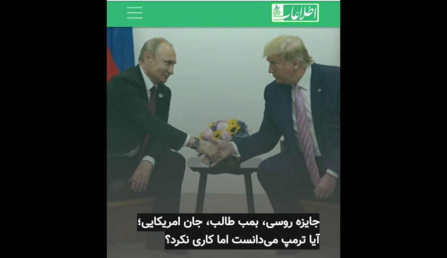 - جایزه روسی، بمب طالبان، جان آمریکایی، آیا ترامپ میدانست، اما کاری نکرد؟ برخی رسانههای غربی مدعی شدند روسیه به شبه نظامیان طالبان در افغانستان برای کشتن نظامیان آمریکایی پول داده است.